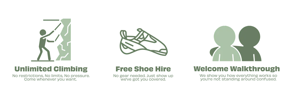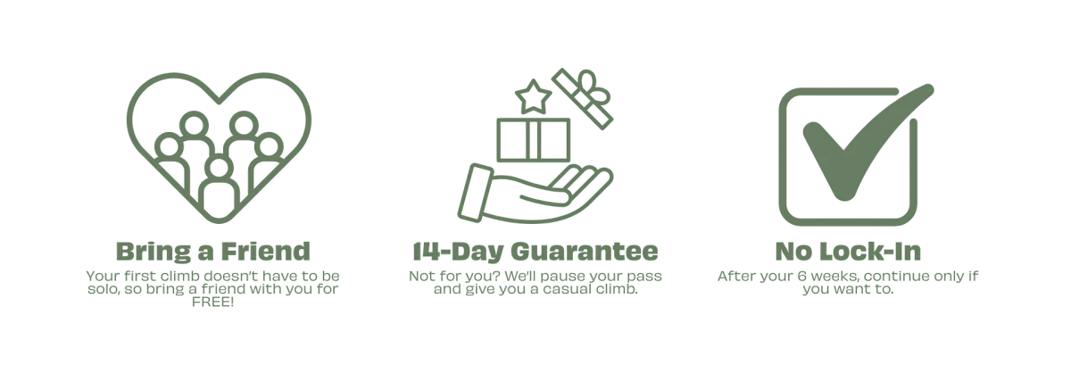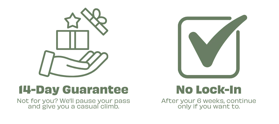 If climbing isn’t for you after two weeks, we’ll switch you to a casual pass and cancel the rest, no pressure, no awkwardness, no lock-in.