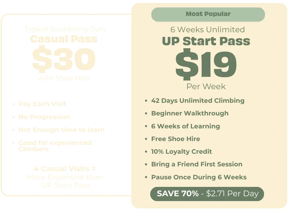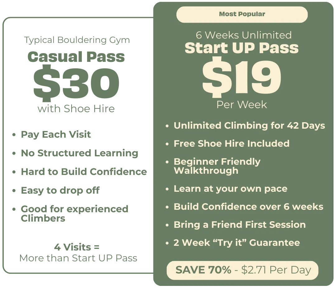 We want people to try climbing properly not just once. You need a few weeks to feel confident and see progress, so we made the Start UP Pass the most affordable way to start.