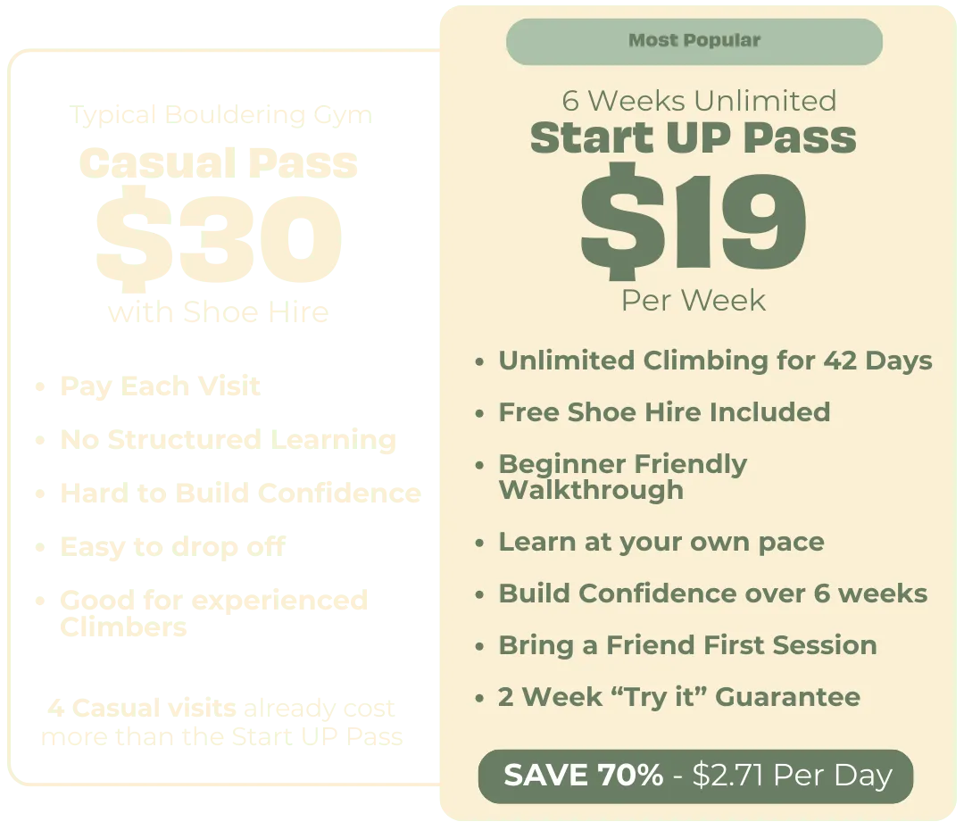 So we built the Start UP Pass, 6 weeks to learn and enjoy climbing properly, get comfortable in the space, and see progress without any pressure.